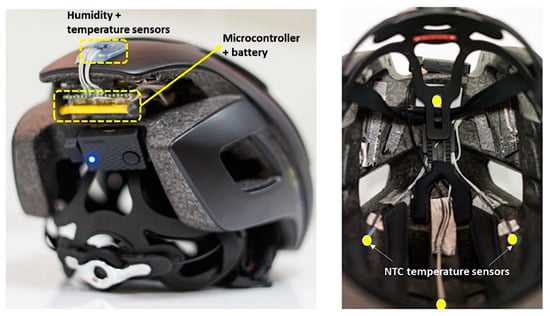 The developed smart helmet prototype showing the microcontroller and the humidity and temperature sensor on the back side of the helmet (left picture) and the four NTC temperature sensors placed in the inner body of the helmet (right picture).