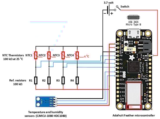 A standard cyclist helmet (312 g) was utilised for the development of the smart helmet prototype (Lazer Bullet 1.0, Lazer Sport, Antwerp, Belgium). The helmet was equipped with a Lifebeam heart rate sensor (Lazer Sport, Antwerp, Belgium; Figure 3) and a 3 × 3 mm digital humidity and temperature sensor (CJMCU-1080 HTC1080, Texas Instruments, Dallas, Texas; accuracy: ±2% for relative humidity and ±0.2 °C for temperature) to measure the surrounding air humidity and temperature. Additionally, four temperature sensors (Negative-Temperature-Coefficient “NTC” temperature sensors, 100 kΩ at 25 °C; Figure 4) were used at the front, back, right and left of the helmet inner body. The final weight of the equipped helmet was 358 g. All sensors were connected directly to a microcontroller (Adafruit Feather 32u4 Bluefruit, Adafruit Industries, New York, NY, USA) that transmitted all data from the helmet to a smartphone via Bluetooth. The Adafruit Bluefruit was chosen as it is the smallest “all-in-one” Arduino-compatible and Bluetooth Low Energy microcontroller with built-in USB and battery charging. The developed system was compatible with a 3.7 V Li-polymer rechargeable battery (LP-523450-1S-3) with the ability to power the system for up to 10 h. A circuit diagram of the used electronics and sensors is shown in Figure 4. The impeded electronics and sensor technology in the smart helmet increased the final original weight of the helmet (312 g) by only 14.7% and did not alter the geometric and aerodynamic characteristics of the original standard helmet. As such, the developed smart helmet is comparable to the original standard helmet (Lazer Bullet 1.0, Lazer Sport, Antwerp, Belgium).