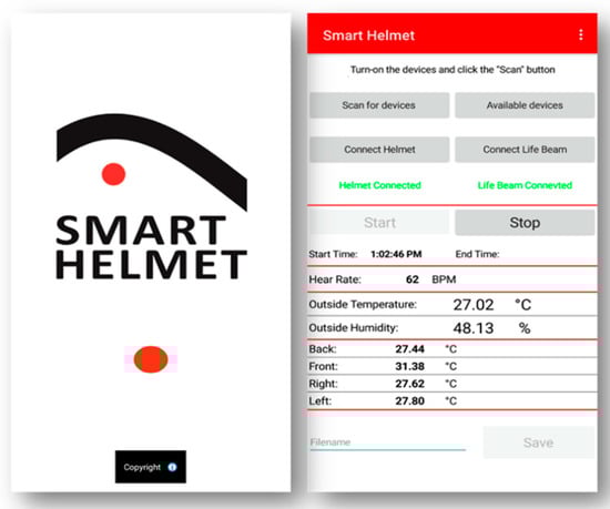 An android-based application “SmartHelmet App” (Figure 5) was developed to simultaneously communicate with both the Adafruit Feather microcontroller and the Lifebeam heart rate monitor via a Bluetooth communication protocol. The SmartHelmet App was developed using the AppyBuilder online platform (App Inventor, Massachusetts Institute of Technology, Cambridge, Massachusetts, USA). The application was designed to receive, display in real-time and store all the data from the SmartHelmet at a 0.2 Hz sampling rate.