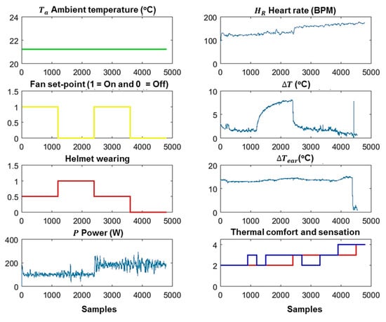 Figure 7 shows the acquired measurements from test subject 1, including environment-related variables, namely, ambient temperature (), air velocity (), helmet thermal resistance and applied power level () and the applied mechanical work rate (). Bioresponse-related variables, including heart rate (), the temperature difference () between the average temperature beneath the helmet and the ambient air temperature, the temperature difference () between the ear temperature and the ambient air temperature as well the thermal comfort (), were considered.