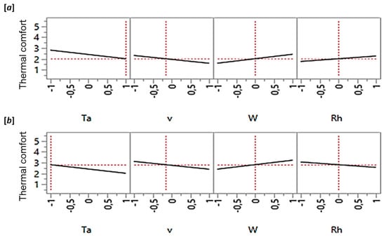 To understand the interaction effect of and on the prediction of thermal comfort, a prediction trace analysis of the model [] was employed using prediction the JMP® profiler tool [], as visualised in Figure 8. For convenience of this analysis, the values of each input variable were scaled (normalised) in such a way to lie in the closed interval [−1, +1], where -1 indicates the variable’s low level and +1 indicates its high level (Figure 8). The scaling of each variable value was done according to the following formula: