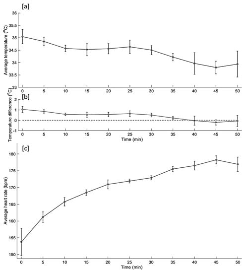 In Figure 9, the average ratings of perceived exertion (), thermal comfort () and thermal sensation () values at the start and end times of the TT are presented for all seven test subjects. The average values (±standard deviation) of all used subjective ratings showed a significant (p < 0.05) increase at the end of the TT ( = 17.6 ± 0.5, = 2.6 ± 0.5 and = 4.4 ± 0.6) compared with their values at the start of the trial.
