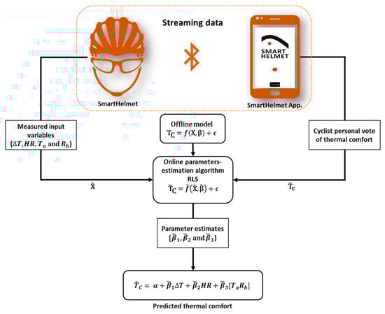 Schematic representation of the proposed online personalisation algorithm to predict thermal comfort under the helmet. The retuning and personalisation algorithm is based on data streaming obtained from the developed SmartHelmet prototype and the cyclist’s personal vote of thermal comfort acquired from the developed SmartHelmet App. The streamed data is fed, together with the developed offline model, to an online parameter estimation algorithm based on a recursive least-squares (RLS) algorithm.