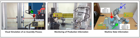 Augmented reality (AR) has been widely utilized in various fields because it can visually superimpose different information, such as text, images, videos, and 3D virtual objects, onto corresponding physical artifacts. In the early stage of AR, it was mainly applied to entertainment, such as games, but recently it has been expanded and applied in various other fields, such as assembly, maintenance, training, remote collaboration, and smart manufacturing [1,2,3,4,5].