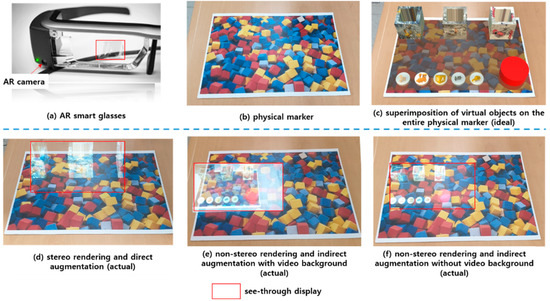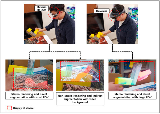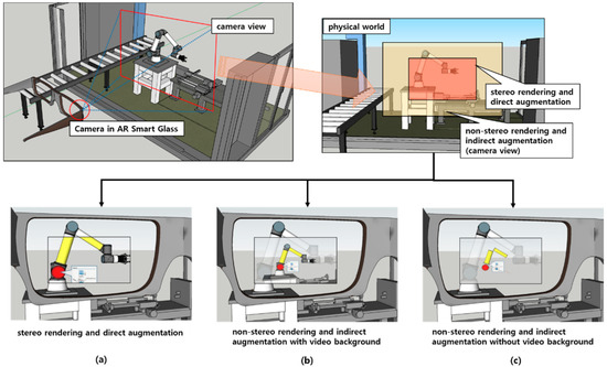 The stereo rendering and direct augmentation is a visualization method that supports almost seamless matching between physical and virtual objects through the see-through display. Thus, a high degree of immersion can be provided to the user, and both the physical object and the virtual object can be viewed without mismatch. However, as the FOV of the see-through display for human eyes is narrower, as shown in Figure 5, even if the virtual object can be matched with the physical object, the amount of information that can be visualized at once is smaller than that of the non-stereo rendering and indirect augmentation method. On the other hand, the non-stereo rendering and indirect augmentation with the video background is a method of augmenting a virtual object on a captured camera image that is rendered on the see-through display. Usually, the camera FOV is larger than that of the display of the AR smart glasses. However, the visual AR information does not match with a physical object. The matching is accomplished from the camera view, not from the user’s perspective. This visual augmentation provides more information to the user simultaneously even if accurate matching between the physical and the virtual objects is not achieved through the display of the smart glasses. However, inconsistency between the physical and virtual objects can cause a cognitive burden on the user in the process of performing tasks. The non-stereo rendering and indirect augmentation without video background deletes camera background image in the second method and renders only virtual information. Thus, unlike the second method, the background image of the camera cannot be seen.