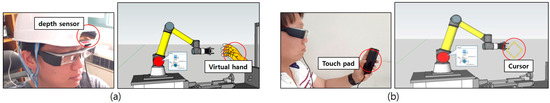 Through the hand gesture-based interaction, the user wearing AR smart glasses can manipulate virtual objects through hand gestures directly (Figure 4a). Besides, it supports bi-manual operations as the worker can use both hands. However, to support hand gesture-based interaction, an additional depth sensor attached to the front of smart glasses is required, and coordinate systems between the smart glasses and the depth sensor must be calibrated. On the other hand, the multi-touch interaction uses a touchpad connected to the AR smart glasses (Figure 4b). The usage is similar to the touch interface of a smart device, such as the smartphone or tablet. Thus, its interaction is familiar to the worker. However, it cannot support bi-manual operations as the worker must touch the pad with one hand.