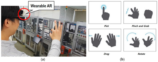 Considering currently available AR smart glasses, interactions with virtual objects in the wearable AR environment can be classified into hand gesture-based interaction and multi-touch interaction, using a touchpad (Figure 4). In particular, as shown in Figure 6a, the hand gesture interaction is similar to how the user performs a task using a hand in a real environment. Through different hand gestures, as shown in Figure 6b, it is possible to achieve interaction, such as selecting (picking or grabbing), moving (dragging), zooming (pinching), or rotating a virtual object, that is visualized in wearable AR.
