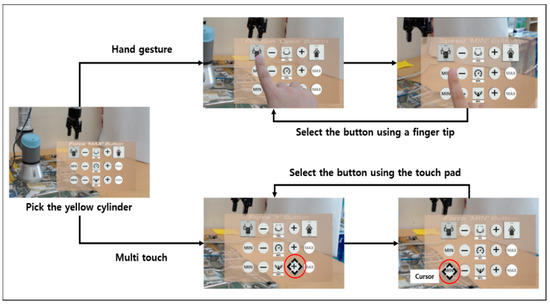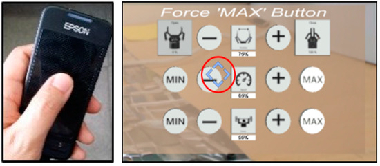Selection or picking is one of the fundamental tasks for the user interaction to perform a specific operation like pushing a button or an icon. Thus, we analyzed the task performance on the selection of virtual icons according to different visual contexts. Through this task, the subject can change the position and orientation of the robot directly. As shown in Figure 12, a virtual control panel for manipulating the UR3 robot is augmented on the see-through display of the AR smart glasses. Then, at the top of the virtual control panel, a required task is shown for the subject to select the icon either with a hand gesture or a touch gesture. The subject must understand the instruction and select the correct icon. For example, if ‘Force +‘ or ’Speed MIN’ are displayed, the subject has to select corresponding buttons on the see-through display. In the case of hand gesture-based interaction, the subject can choose the virtual icon directly with their finger. In the case of touch interaction, the user moves the cursor in the touchpad and selects the right button by touching the pad. This task continues until the subject selects all the required buttons to complete a required task.