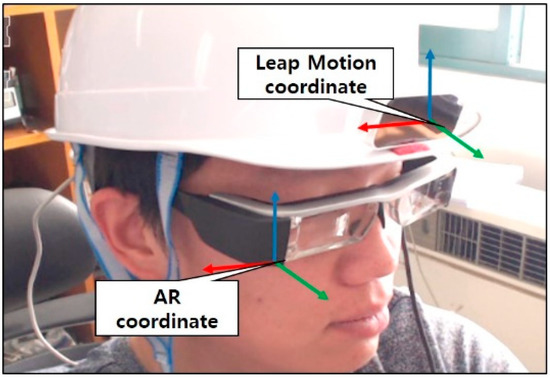 We used a Leap Motion sensor [41] as a depth sensor to track the user’s actual hands to support the hand gesture interaction. As shown in Figure 8, the Leap Motion sensor was attached to the front of the safety helmet of the worker or the smart glasses, while the AR camera was embedded in the AR smart glasses. The absolute orientation algorithm [42,43] was used for the calibration of the two coordinate systems.