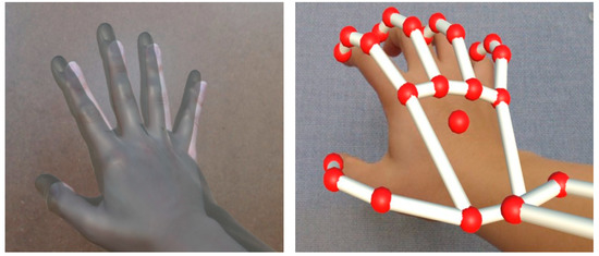 Through the calibration between the AR camera and the Leap Motion sensor, the real hand can be matched with a virtual hand in the wearable AR space, as shown in Figure 10.