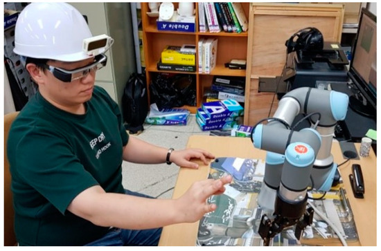 Through the experiment, quantitative and qualitative assessments of visual contexts and interaction gestures were conducted. For the quantitative evaluation, the completion time of each task was measured. After the completion of all the tasks, surveys and interviews were also conducted for qualitative evaluation. The questionnaire consisted of questions that were evaluated based on a 7-point Likert scale (1: strongly disagree, 7: strongly agree). In particular, we used all the questions from the System Usability Scale (SUS) [45] without any modification. SUS is well-known as an objective questionnaire for usability evaluation. We have not listed them in this paper. Figure 11 shows a snapshot of the worker who performed a matching task with the Universal Robot-3 (UR3) robot. UR3 is a famous intelligent and collaborative robot widely used in manufacturing environments.