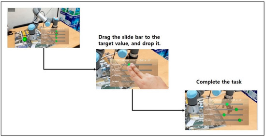 A detailed step for the dragging and dropping task is shown in Figure 13. The dragging and dropping task is a 2D operation on the 3D plane. Thus, this task evaluates the performance of 2D-based manipulation in the 3D space. The mission of this task is to move a visual object to the desired position by dragging and dropping a specified virtual icon or slide bar in the virtual control panel. As shown in Figure 13, the virtual control panel displays the type of a slide bar and its attribute value to be adjusted. Then, the subject has to understand the required task and to slide the bar to the desired value using a hand gesture. For example, for the UR3 robot, the worker can pull a slide bar to change the joint angle of the robot or to change the speed of the robot movement. Finally, this task is completed when the subject controls the slide bar to the desired location.