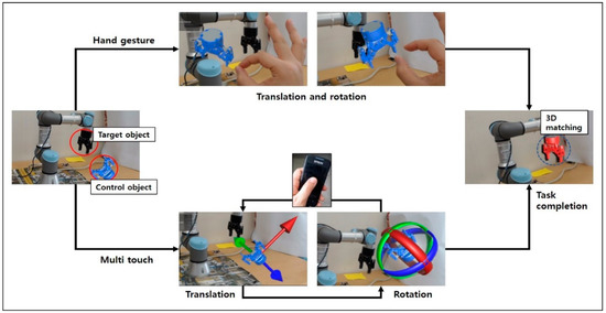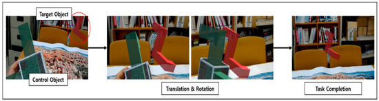 The subject has to recognize the position and orientation of the physical object and has to find the virtual object. After understanding the configuration, the subject selects a virtual control object with the hand gesture or touch gesture, then translates and rotates it, and finally matches it with the target object. In the hand gesture interaction, the control object is selected by conducting a pinch gesture (Figure 6b) with the index finger and thumb. Whenever the subject’s hand is moved and rotated, the control object is also moved and rotated. In the case of touch interaction, the subject performs a translation and rotation operation separately since the touch interaction cannot support both operations simultaneously. For this reason, the translation mode and the rotation mode are provided. The task is completed when the control and target objects are matched geometrically.