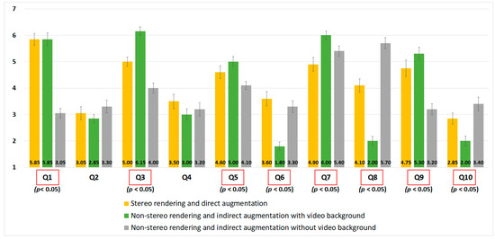 After the experiment, the workers were asked to fill out the questionnaire. We analyzed the cognitive load in performing manufacturing tasks since the real industrial field is different from a controlled environment, and wearable AR should not provide additional cognitive burden. We conducted another qualitative evaluation based on the validated questions from NASA task load index (NASA-TLX) (1: very low, 7: very high) [48]. Questions in the NASA-TLX questionnaire include (1) required-mental and perceptual activity, (2) required-physical activity, (3) time pressure felt, (4) hard to work, (5) successful in accomplishing goals, and (6) stressed. We also used these questions without any modifications. Details are shown in Reference [48]. According to the questionnaire analysis (Figure 24), subjects mentioned that they could perform given tasks with less cognitive load with the help of wearable AR. They were satisfied with the visualization and interaction of manufacturing information using AR smart glasses. Some of them commented that wearable AR was very effective when used for training or task assistance with beginners.