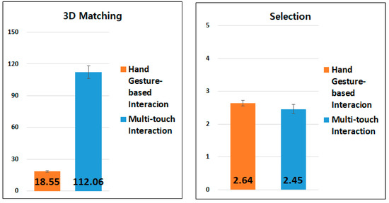 For the 3D virtual object matching task concerning different gesture interactions, the hand gesture interaction demonstrated faster task completion time than the multi-touch interaction. The faster task completion is due to the concurrency control of the interaction (selection, translation, rotation, etc.) and intuitiveness of using a real hand to perform the task. Since the hand gesture-based interaction provides the same metaphor as the user performs typical tasks in the real environment, the user can simultaneously perform the translation and rotation without a separate mode change through the selection of the menu using their hand. On the other hand, in the case of the multi-touch interaction, whenever a control object is selected through the touchpad of smart glasses or the transformation needs to be changed, this method requires a lot of interaction with the gizmo. Furthermore, the user must change the mode to select and manipulate the control object whenever a different transformation is required.