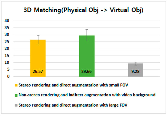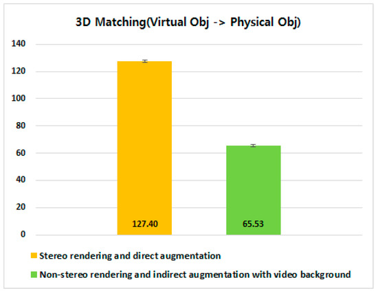 Depending on the role of the control and target objects for the 3D matching task in the first and second experiments, there was a difference in task performance. The reason for this result is related to whether the control object with which the user interacts is virtual or real. For the 3D matching in the first user study, the control object was virtual. Thus, when the user moved and rotated the control object, the control object always had to be in the user’s field of view. However, as the control object in the second evaluation was real, it was not necessary to place the control object in the user’s field of view in the AR smart glasses. That is, when the user recognized the location and orientation of the target object while holding the control object, the task could be conducted without looking at the control object.