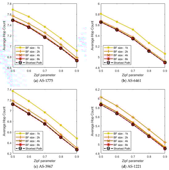Figure 6 shows the average number of hops according to the various sizes of the Bloom filter, and the performance of the proposed scheme is compared to the