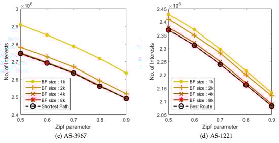 The performance of the proposed algorithm was compared to those of shortest path and flooding. The size of a Bloom filter of the proposed work in this comparison was fixed as 2048 bits, which has the minimum memory consumption for all topologies. The shortest path in ndnSIM uses Dijkstra’s algorithm, which guarantees the packet delivery along the optimal path using the minimum amount of Interest packets. The performance of the three schemes was compared based on the shortest path. The flooding scheme forwards an Interest packet to all faces other than the incoming face of the Interest if no matching entry is found in an FIB table. When a Data packet arrives as a response, the FIB table is updated using the incoming face of the Data packet as the output face of the longest matching name prefix for the Interest.