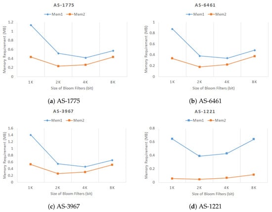 5). The memory consumption for the proposed scheme consists of the memory consumptions for Bloom filters and auxiliary FIB tables. As the size of the Bloom filter grows, the memory requirement for the Bloom filter naturally increases, but the number of auxiliary FIB entries decreases. As shown in the figure, the memory usages for all topologies are minimal when the size of the Bloom filter is 2048 bits.