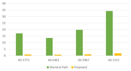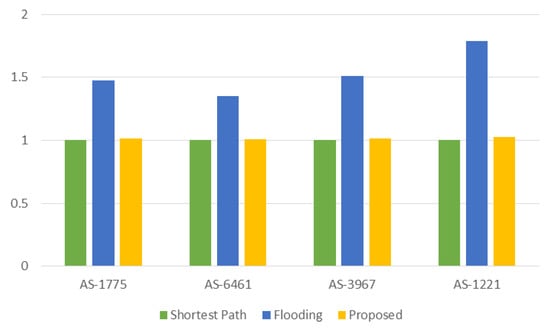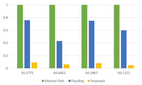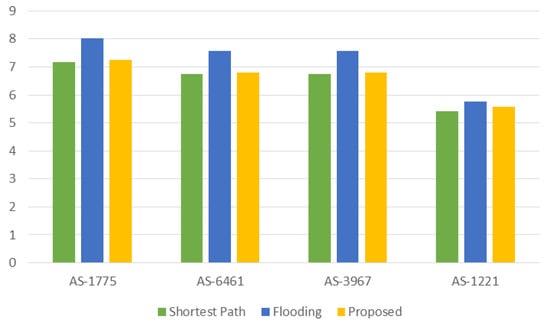Figure 12 compares the traffic amounts for routing. Because the traffic amounts for routing are related to the number of links in the network, more traffic is required for the networks with more complicated connections. Hence, the amount of consumed traffic is minimum for AS-6461. While the