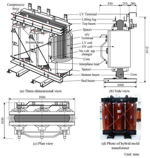 The hybrid mold transformer is an electrical element that has the advantages of a high-efficiency transformer as well as a power-saving function. Such transformers are power-saving devices that can help buildings save power by reducing unnecessary power loss. The hybrid mold transformer used in this study is the cast resin-type with a maximum capacity of 1000 kVA and overall dimensions of 2110 mm (height) × 1900 mm (length) × 1030 mm (width). The total mass of the transformer was 3800 kg according to the data provided by the manufacturer. Figure 1 and Table 1 show brief descriptions of the major components of the transformer, which include the core, frame system (top beam, bottom beam, and bed beam), high-voltage (HV) coils, low-voltage (LV) coils, and various accessories (Lifting lugs, LV & HV terminal, spacer, etc.). As shown in Figure 1, the core was made of cold rolled silicon steel and assembled with a frame system via bolt connections; the HV and LV coils cast in epoxy with a mold under vacuum were not strongly fixed to the core but instead indirectly connected through the friction generated from the compressive forces between the tightened bolts and spacers.