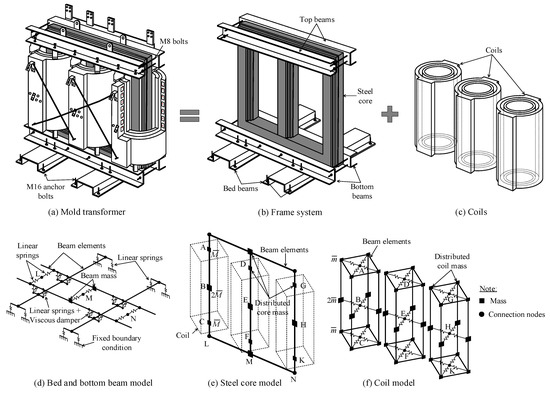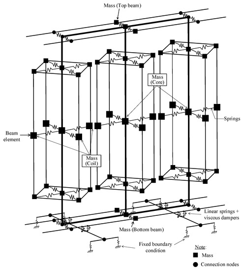 In addition, the coils were cast in epoxy with an average elastic modulus of 100,000 N/mm2 and yield strength of 110 MPa, according to the specifications of the manufacturer. In the analytical model, three coils were modeled as the system of beam elements and connected to the core by the linear springs at points A–K, as shown in Figure 2f. In order to consider the distribution of coil mass, the total mass of each coil of 0.42 ton (according to the manufacturer’s specifications) was divided into 12 distributed masses at the top, middle, and bottom locations of each coil. The distributed masses at the middle are twice those at the top and bottom, as shown in Figure 2f. Each coil has a height and width of 1200 mm and 610 mm, respectively.