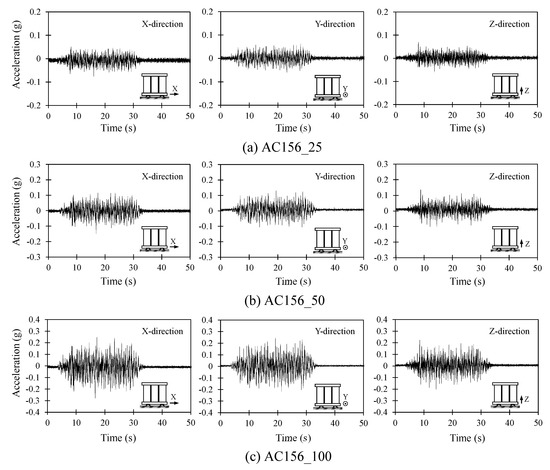 The accuracy of the aforementioned analytical modeling approach was assessed by comparing the analytical results to the experimental data from the shaking table tests [27]. In the shaking table test, the input acceleration–time histories were generated based on AC156 code for nonstructural elements [24]. Table 4 shows a brief summary of the peak ground acceleration (PGA) of each test label used in the shaking table test series. For model validation, test labels denoted as AC156_25, AC156_50, and AC156_100 were used and applied to the analytical model. Figure 4 shows the tri-axial acceleration time histories of AC156_25, AC156_50, and AC156_100.
