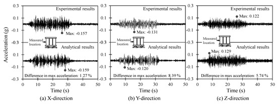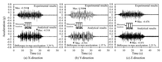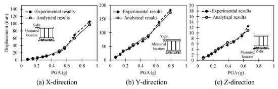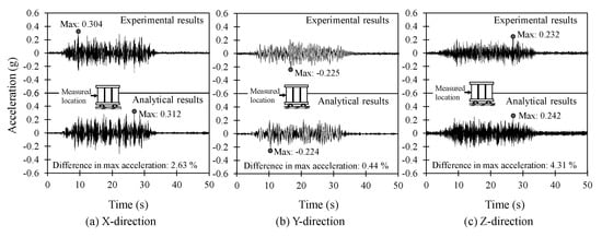 - The proposed analytical model showed good agreement with the data obtained from the shaking table test in terms of the shapes of acceleration–time history response, peak amplitude of acceleration response in tri-axial directions, the results of Fourier-transform (FT) analyses of acceleration response in frequency domain, the shapes of displacement–time history response, and the maximum displacement with a wide range of PGA.