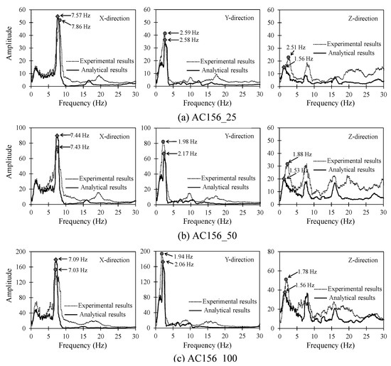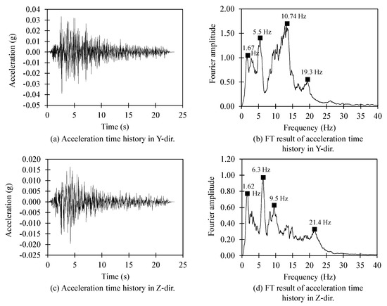 Figure 5, Figure 6 and Figure 7 compare the acceleration–time history responses obtained from the analytical and experiment results at the left coil subjected to the input acceleration time histories illustrated in Figure 4. The comparisons in Figure 5, Figure 6 and Figure 7 indicated that the shapes of the acceleration–time history response and the peak amplitudes of acceleration response in the X, Y, and Z directions obtained from the analytical results were consistent with the obtained test data. In addition, Figure 8 compares the Fourier-transform (FT) analyses results in the frequency domain of the response output signals acquired from the experimental and the analytical results. Despite the time differences, where the peak amplitude of the acceleration response occurred, the outcome of the FT analyses in the frequency domain was consistent with the experimental results in terms of the shape of amplitude-frequency curves and the frequency with respect to the peak amplitude.