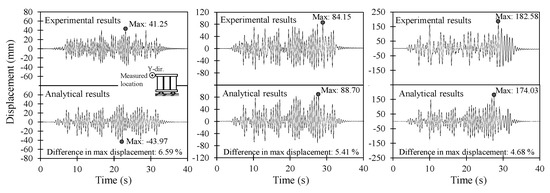 Comparison of displacement–time history responses in Y-direction between analytical and experimental results.