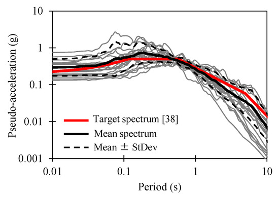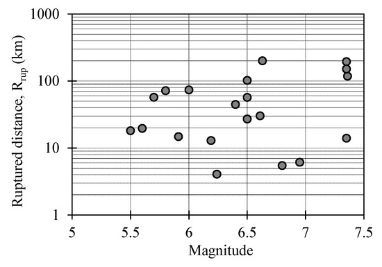 The time history ground motions were derived from historical recordings so that their mean response spectrum matched the target design acceleration spectrum evaluated according to the Korean Building Code (KBC 2016) [38]: Sds = 0.497 and Sd1 = 0.287, and their shear wave velocity (Vs,30) in a range of 180 m/s to 760 m/s, which was complied with the soil type C and D [38]. The SRSS-based pseudo-acceleration response spectrum of selected ground motion was demonstrated in Figure 12. The selected earthquake ground motions were presented in detail in Table 5. These earthquake records cover the ranges of magnitude from 5.5 to 7.5, of shear wave velocity (Vs,30) from 198.77 to 634.33 m/sec, and of closet ruptured distance (Rrup) from 4.06 to 199.84 km. Scatter diagrams of magnitude versus closet ruptured distance (Rrup) and magnitude versus peak ground acceleration of the selected ground motions are illustrated in Figure 13 and Figure 14, respectively.