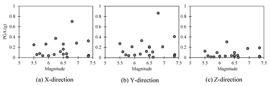 Magnitude versus peak ground acceleration (PGA) of selected ground motions.