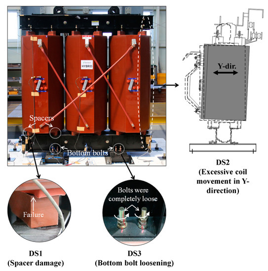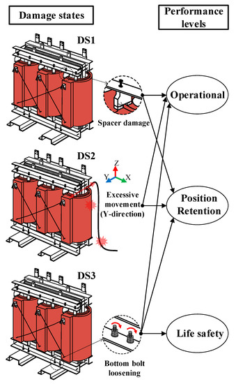 From the shaking table test results, three weak points of the mold transformer were adopted as critical damage states, as shown in Figure 15. The first damage states (DS1) correspond to the failure of the spacers, the second damage states (DS2) correspond to the excessive coil movement in Y-direction, and the third damage states (DS3) correspond to the loosening of linked bolts between the bottom and bed beams. According to the recommendation specified in ASCE 41-17 Standard [42], the target performance levels used to evaluate the seismic vulnerability of the nonstructural elements for buildings can be selected among Operational (OP), Position Retention (PR), and Life Safety (LS). Specifically, the OP performance level involves the functional nonstructural equipment required for normal use regardless of minor damage; the PR performance level involves nonstructural equipment, which is secured in place and might be able to function if necessary service is available; and the LS performance level involves nonstructural equipment that can sustain significant damage but not become dislodged and fall in a manner that could cause death or serious injury to occupants or people. In order to evaluate the seismic performance of the mold transformer, the target performance levels were selected based on the correlation with critical damage states, as shown in Figure 16. Specifically, damage in spacers (DS1) can lead to slippage of the HV and LV coils away from the original positions and the interaction between them, which involve the OP and PR performance levels; and excessive movement in the Y-direction (DS2) can cause interaction with the adjacent equipment and breaking of the electrical wires, which involve the OP and PR performance levels; and the degree of loosening at the bottom bolts (DS3) can affect the functional operation or lead to the collapse of the entire transformer and threaten human life, which involve the OP, PR, and LS performance levels.