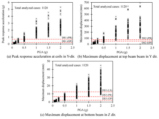 The peak response results obtained from the analytical model of the mold transformer are illustrated in Figure 17 in terms of the different parameters represented for damage states: the peak response acceleration at the coils in the Y-direction (Figure 17a), maximum displacement at the top beam in the Y-direction (Figure 17b), and maximum displacement at the bottom beam in the Z-direction (Figure 17c). As the peak ground acceleration increases, the maximum response from the analytical model increases as well, indicating increased physical damage to the mold transformer. Moreover, the limit values corresponding to the damage states for each performance level are presented in Figure 17. In order to establish the fragility curves, these analytical results provide the fraction of the analyses that lead to the exceedance of limit states corresponding to specific performance levels. In total, 1120 cases were analyzed with consideration of the variety of earthquake ground motion characteristics and uncertainty in modeling parameters to establish the fragility curves of the hybrid mold transformers.