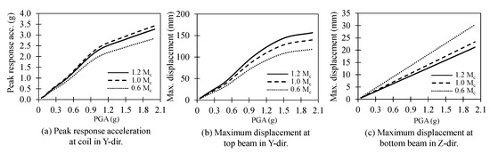To further elucidate the effects of uncertain modeling parameters on the performance of the mold transformer in an earthquake, Figure 18 presents the characteristics of the Friuli_Italy-01 Earthquake used for dynamic analysis in terms of the acceleration time histories in the Y and Z-directions (Figure 18a,c) and corresponding FT results in the frequency domain (Figure 18b,d). In both directions, at least four resonance frequencies could be clearly observed in the frequency domain, from 1.67 Hz to 19.3 Hz in the Y-direction. Figure 19 shows the effect of the mass coil, Mc, on the main responses of the transformer: peak response acceleration at the coil in the Y-direction, maximum displacement at the top beam in the Y-direction, and maximum displacement at the bottom beam in the Z-direction. In general, the peak response acceleration at the coil and the maximum displacement at the top beam in the Y-direction showed a nonlinear increase when the PGA was greater than 1.0 g, while the maximum displacement at the bottom beam in the Z-direction showed a linear increasing trend. Moreover, when the coil mass varied in the range of 0.6 to 1.2 Mc, at the PGA of 2.0 g, the peak acceleration response in the Y-direction varied in the range of 17 %, the maximum displacement at the top beam in the Y-direction varied in the range of 15%, and the maximum displacement at the bottom beam in the Z-direction varied in the range of 30%. In Figure 20, the effect of the translational stiffness, Kt, on the main parameters was also presented. As shown in Figure 20a, the effective translational stiffness has a great influence on the peak acceleration response. For example, at the PGA of 2.0, the peak acceleration response in the Y-direction in the case of 1.0 Kt was about 50% lower than that of 0.8 Kt and about 30% greater than that of 1.2 Kt. Meanwhile, the effective translational stiffness had a negligible influence on the displacement in the Y-direction and the Z-direction (Figure 20b,c). Moreover, in all cases, the effect of the rotational stiffness in the range of 0.8 to 1.2 Kθ on parameters was also negligible.