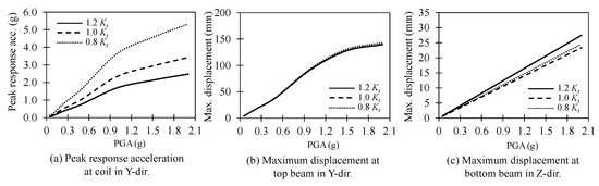 Moreover, in reality, the mold transformers can be manufactured with different configurations and specifications, which can lead to variations in performance when subjected to the same earthquake. In order to consider such uncertainty in the modeling parameters of the mold transformer when estimating the fragility curves, various dynamic parameters of the mold transformer were investigated in terms of the effective stiffness and the coil mass. Specifically, three cases of effective translational stiffness (0.8 Kt, 1.0 Kt, and 1.2 Kt), three cases of effective rotational stiffness (0.8 Kθ, 1.0 Kθ, and 1.2 Kθ), and three cases of coil mass (0.6 Mc, 1.0 Mc, and 1.2 Mc) were investigated for each time history analysis; based on the test results, 1.0 Kt, 1.0 Kθ, and 1.0 Mc were the values of the modeling parameters chosen for the prototype analytical model.