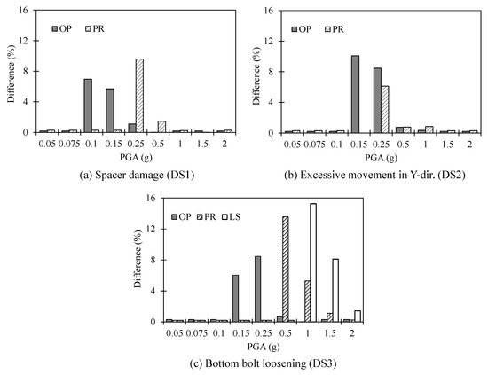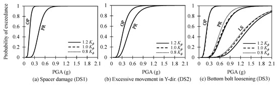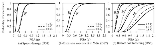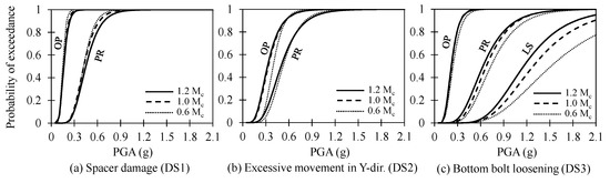 When correlating the performance levels and damage states, the values of the limit states were defined for each target performance level corresponding to the damage states. The parameters by which the limit states were evaluated were partly based on the observation from shaking table test results [27] and partly based on judgment. Specifically, for the DS1, the peak response acceleration at the coils (PRA) in the Y-direction is strongly related to the spacer damage due to the fact that the lowest effective stiffness is in this direction. Accordingly, for the DS1, the values of the limit states corresponding to the OP and PR performance levels were respectively determined to be 0.22 g, which corresponds to the time when the cracks were initially formed, and 0.69 g, which corresponds to the time when the spacers were failed, as observed during shaking table tests. For the DS2, the maximum displacement in the Y-direction at the top beams is strongly related to the excessive movement of the transformer. Accordingly, the values of the limit states corresponding to the OP and PR performance levels were determined to be 50 mm and 75 mm, respectively, based on the provisions as well as the recommendations of the Korea Research Institute [43]. For the DS3, the maximum displacement in the Z-direction at the bottom beam is strongly related to the degree of loosening of the link bolted between the bottom beam and bed beam; and the values of the limit states corresponding to the OP, PR, and LS performance levels were determined to be 2.2 mm, 6.6 mm, and 12.45 mm, respectively, based on the experiment test results [27]. The summary of the value of the limit state corresponding to each damage state is presented in Table 6.