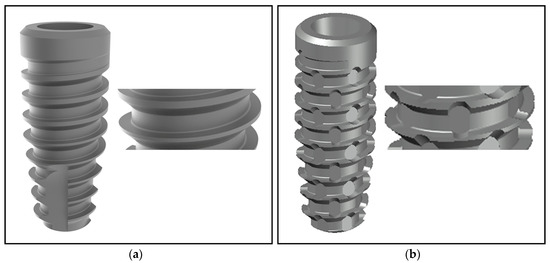 Representative image of the implants and thread closed: (a) Traditional conical implant macrogeometry and (b) new conical implant macrogeometry.