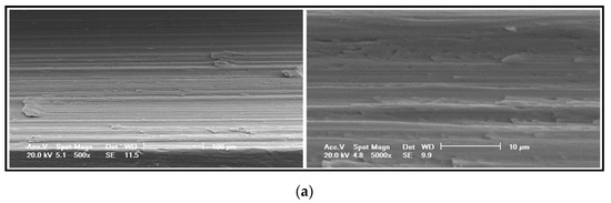 Representative SEM images of the two surface models used in both implant macrogeometry: (a) Without treatment (machined surface) and (b) with surface treatment.