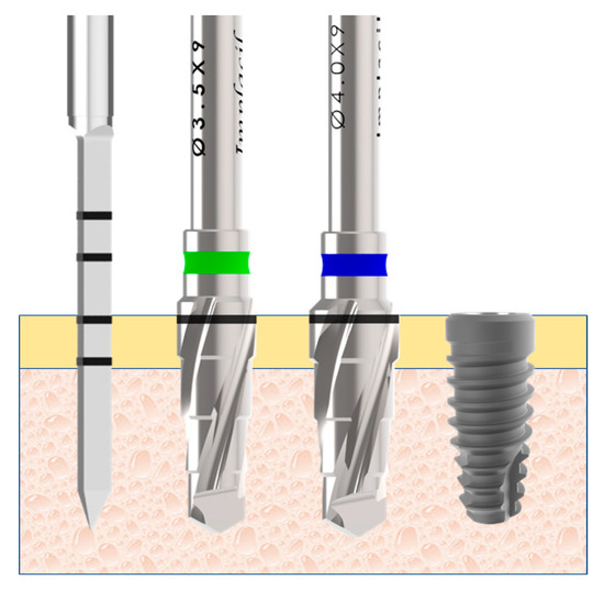 The surgical technique used to elaborate the osteotomy and the macrogeometry of the implant is also a factor considered of great importance in the process of osseointegration. Several models with different macrogeometries and surface treatment have been proposed and are commercialized [14,15,16], with each design following its specific recommendations as to the type of bone where it should be used and the specific surgical technique for its installation [17]. Conventionally, osteotomy is performed with the last drill having a smaller diameter in relation to the implant diameter, so that it is inserted with a high degree of torque. Obviously, the more sub-dimensioned the bed receiving the implant is, the greater the insertion torque. However, it is speculated that high levels of torque can cause a high compression in the bone tissue, which can lead to extensive bone remodeling over time [18]. Several other studies have shown that depending on the insertion torque of the implant and whether it is beyond the physiological tolerance limit, it may present microfractures or osteonecrosis by compression [19,20,21].