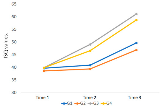 Line graph showing the ISQ evolution on the different times in each group. Time 1 = immediately at the installation; Time 2 = 15 days after the installation; Time 3 = 30 days after the installation.