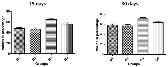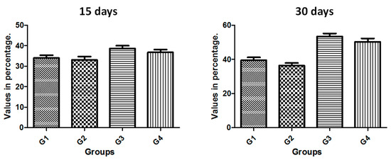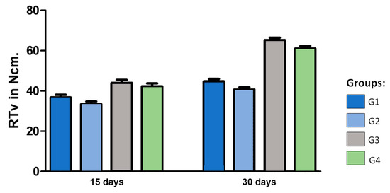 The four groups showed a different mean of RTv values, with statistical difference between them (p < 0.05). The data are summarized in Table 3. Table 4 shows the Bonferroni test and p-values of the comparison between the groups in each time. The bar graph of Figure 9 showed the RTv values to compare the difference between the groups in the two times.