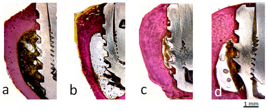 Representative images of the groups 30 days after the implantations. (a) G1 group, (b) G2 group, (c) G3 group, (d) G4 group. Images obtained by light microscopy with magnification of 10×.