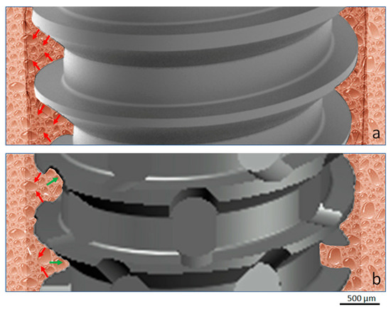 Schematic image to show the bone compression during the implant installation (red arrows) and decompression (green arrows) on the healing chambers. (a) Conventional threads design and (b) new threads design with healing chambers.