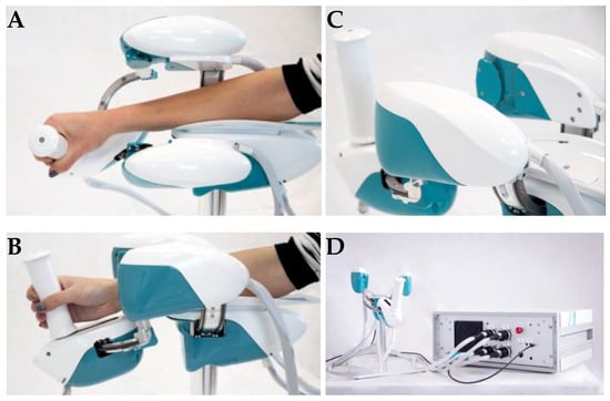 In the first category, i.e., actuated by an electric motor, are the exoskeletons, L-Exos [], UL-Exo7 [], GENTLE/G [], REHAROB [], and Armeo Power (Hocoma, Switzerland), and the end-effector systems, InMotion ARM, In Motion WRIST (Bionik), MIT-MANUS [], and Braccio di Ferro []. Conversely, the exoskeletons, Pneu-Wrex [] and BONES [], are based on pneumatic muscles. Finally, the T-Wrex [] and its commercial version, ARMEO Spring (Hocoma, Switzerland), only provide gravity support to the whole arm with no robotic actuation [].