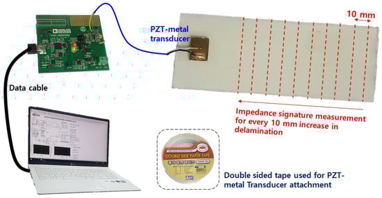 The idea of the PZT–metal transducer proposed in [] used a commercialized epoxy adhesive for attachment to the host structure. Thus, to make the PZT–metal transducer re-attachable, a simple idea of using a double-sided tape (purchased from www.alpha.co.kr) is evaluated in this section against debonding and crack damage. Figure 1 shows the experimental setup to evaluate the performance of the PZT–metal transducer with double-sided tape attachment. The AD5933 evaluation board is connected to the laptop as shown in the figure where the positive and negative wires from the board are attached to the PZT–metal transducer by soldering. More details on the PZT–metal transducer with its damage detection performance can be found in []. For evaluating the performance of the PZT–metal transducer, two glass fiber epoxy laminates of 200 mm × 70 mm with 0.4 mm thickness were adhered to each other using a commercialized epoxy (Loctite Quick-set). After fully curing the epoxy for 48 h at room temperature, the impedance signature was measured from 25 to 75 kHz in 100 Hz steps to be used as a reference signature. Then, debonding was achieved by inserting a chisel tip between the two composite plates and seperating them apart 10 mm at a time until 100 mm debonding was achieved. For each 10 mm of debonding, impedance sigantures were measured. After 100 mm debonding was achieved, the final impedance signature was measured with complete debonding of the bottom composite plate. The reason for this was to observe the difference in the impedance signature subjected to debonding that occurs away from the PZT transducer and which that occurs right below the PZT transducer. To check the reliability of the double-sided tape attachment approach, five identical tests (Test 1, Test 2, Test 3, Test 4, and Test 5) were conducted.