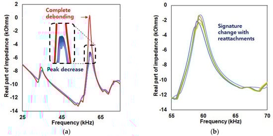 Impedance signature results for: (a) Debonding experiment; (b) re-attachable performance of the PZT–metal transducer.