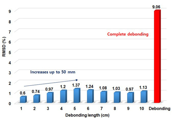 Looking at Figure 3, the RMSD values with the reference signature being the intact case, the RMSD value was 0.6% with 1 cm debonding and increased to 1.37% with 5 cm debonding. However the RMSD values decreased down to 0.97% with 9 cm debonding. This shows the limitation of debonding detection using the PZT–metal transducer, where it seems that the highest value that can be obtained from this test is 1.37%. With full removal of the bottom composite plate, the RMSD resulted in 9.06%. Table 1 summarizes all the five test results including the data from Figure 3. Although the same tests were conducted, the RMSD results were different. With Test 2, all the RMSD values were below 1% and it was difficult to observe the increasing trend subjected to increase in debonding length. However, debonding below the PZT–metal transducer resulted in 10.29% once again proving that this NDT technique is effective at finding damage below the sensor. For Test 3, the increasing trend was clearly seen with increase in debonding length as the RMSD value started from 0.66% and rose to 2.31% with 8 cm debonding length. Here, the RMSD value with full removal of the bottom plate resulted in 10.98%, which shows that the reliability of finding defects located under a PZT–metal transducer is very effective. Tests 4 and 5 show similar results compared to Test 2 where all the RMSD values were below 1%, where the values generally increase with increase in debonding length. With full removal of the plate, the RMSD values were 11.9% and 15.32% for Tests 4 and 5, respectively.