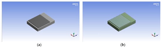 ANSYS FEM model: (a) PZT–metal; (b) mesh with 1096 elements.