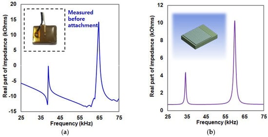 Figure 5a shows the actual impedance signature of the PZT–metal transducer in air using the AD5933 evaluation board, and Figure 5b shows the impedance signature from the ANSYS simulation. Comparing both results, although the shapes of the signature are slightly different, the resonance frequency range from the FEM simulation result matches very well with the actual experimental result. Two large resonance peaks exist, where the larger one is located at around 65 kHz for both results (Figure 5a,b), and the smaller resonance peak for both signatures is located near 40 kHz. Furthermore, the amplitude of the large peak is around twice the size of the smaller resonance peak.